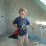 Besonders lustig fanden wir das Foto, auf dem Cosima wie ein Zwerg unter der schrägen Wand unterwegs ist. Auch Jonathan erkennt hinter den Anschlüssen schon die Badewanne? Wunderbar, wie sich der „Vorgarten “ als Sandspielplatz eignet.