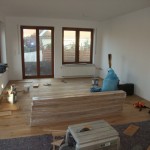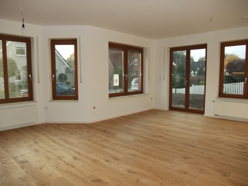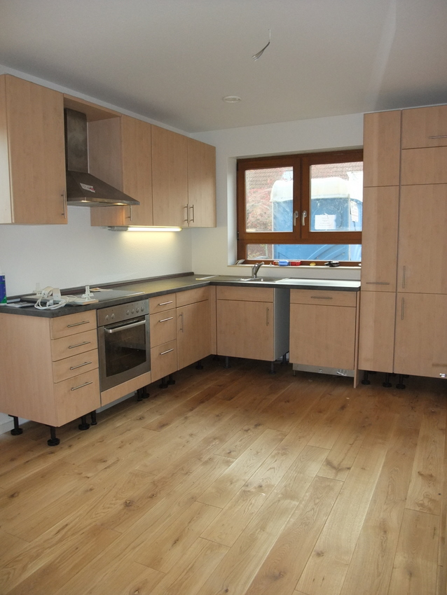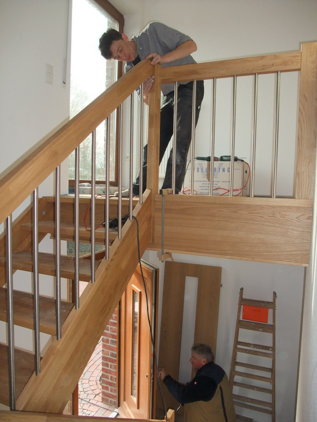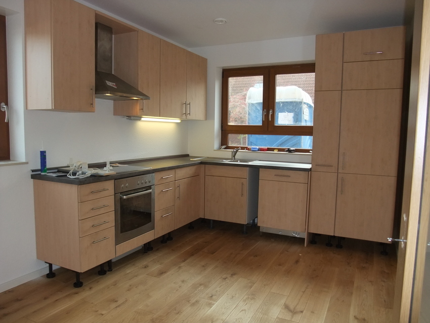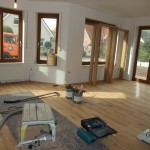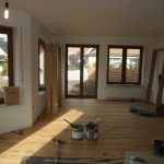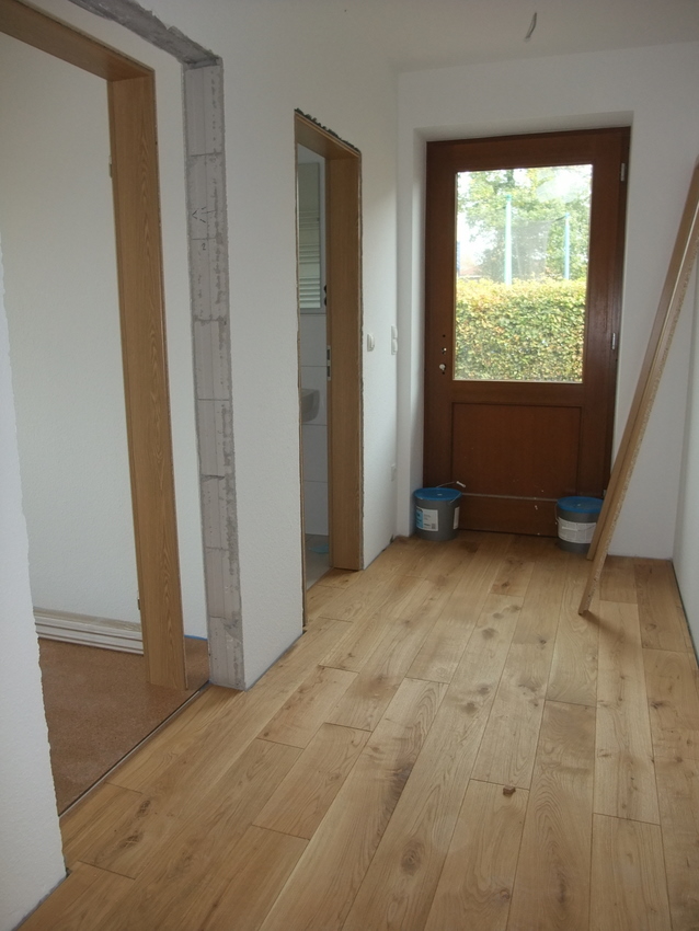 8 Gewerke gleichzeitig auf der Baustelle, Elektriker, Verfuger, Heizungsfirma, Treppenbau, Bodenleger, Parkettleger, Küchenbau, Tischlerei für Türen und Zargen und abschließend der Blower Door Test: