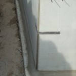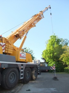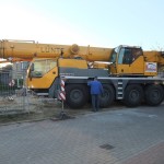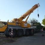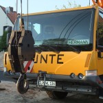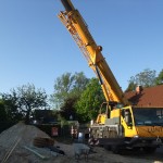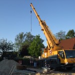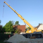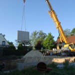 Um 6:30 Uhr war der Kran schon auf der Baustelle, kurz darauf folgte der Laster mit den Kellerwänden. Mit der engen Straße hatte der Laster seine liebe Mühe, doch irgendwann war es geschafft und die Wände konnten abgeladen werden.