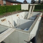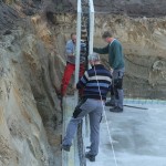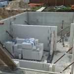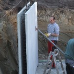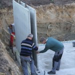 Die Kellerwände werden als teilvorgefertigte Elemente geliefert. Diese werden auf die Stahlarmierungen der Bodenplatte gestellt und anschließend mit Beton ausgefüllt.
