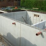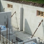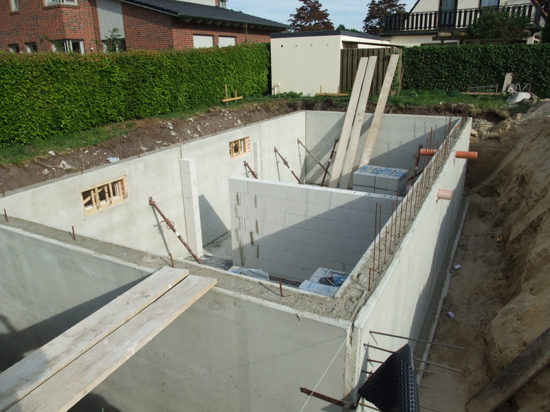 Inzwischen ist es Abend geworden und die Kellerwände sind betoniert. Die ersten Innenwände sind schon gemauert.