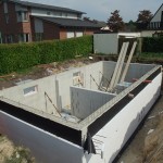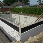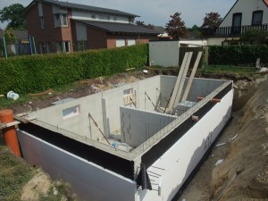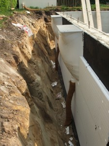 Nachdem gestern die Kellerwände gesetzt und betoniert wurden, war heute die Außenseite dran: Nach der Abdichtung mit Dickbeschichtung wurden 6cm dicke Perimeterdämmplatten aufgebracht. Um den gesamten Kellersockel verläuft zudem eine Ringdrainage, die in einem Pumpenschacht mündet. Die Kellerfensterschächte werden ebenfalls in diese Ringdrainage entwässert.
