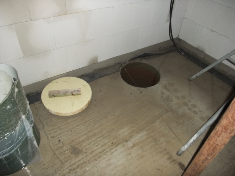 Im Keller steht noch etwas Wasser. Der Pumpensumpf im zweiten Kellerraum, der Heizung, Waschmaschine und Trockner enthalten wird, ist vollgelaufen. Noch ist keine Tauchpumpe installiert: