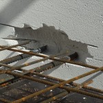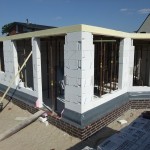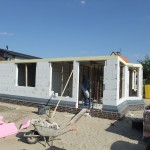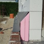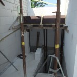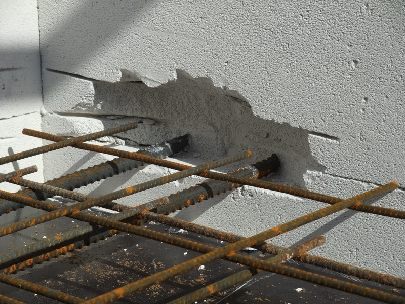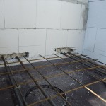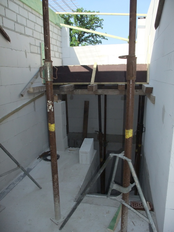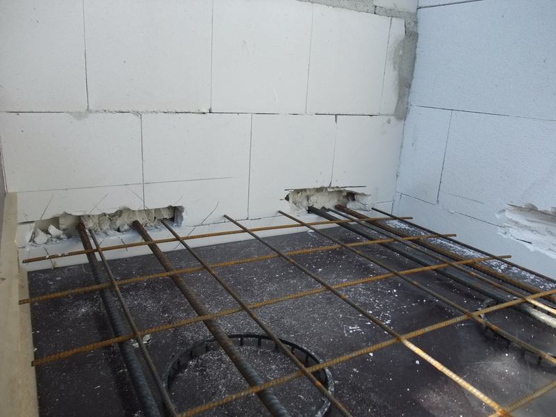 Die Bilder 2 und 3 zeigen die Befestigung des Treppenabsatzes (Bild 4). Er wird mit Stahlstangen in die Seitenwände verankert und mit Beton ausgegossen. Auf den Bildern 5 und 6 sieht man die dicke Dämmschicht und den Wasserschutz für den unteren Mauersockel. Das Wasser, welches durch Regen oben in das Mauerwerk eindringen kann, wird unten über die Folie wieder nach außen abgeleitet.