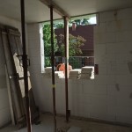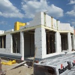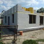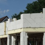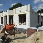 Bei bis zu 30° C Außentemperatur entstanden heute die Außenmauern im Obergeschoss. Die Lücken, auf den Bildern 1 – 3 gut zu sehen, werden verschalt und wohl mit Beton aufgefüllt. Da muss der Dachstuhl getragen werden (sofern ich als Laie das beurteilen kann).