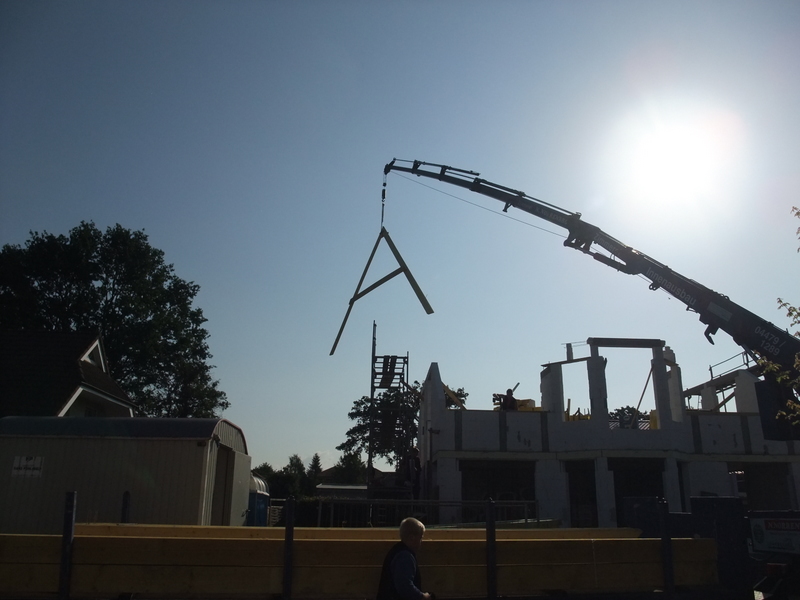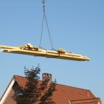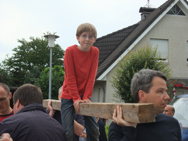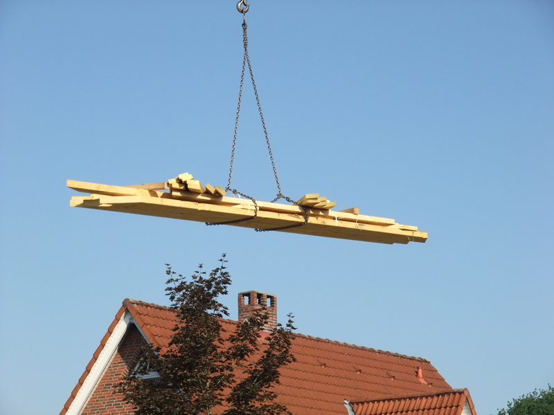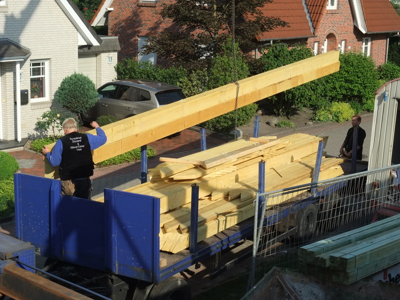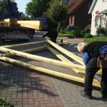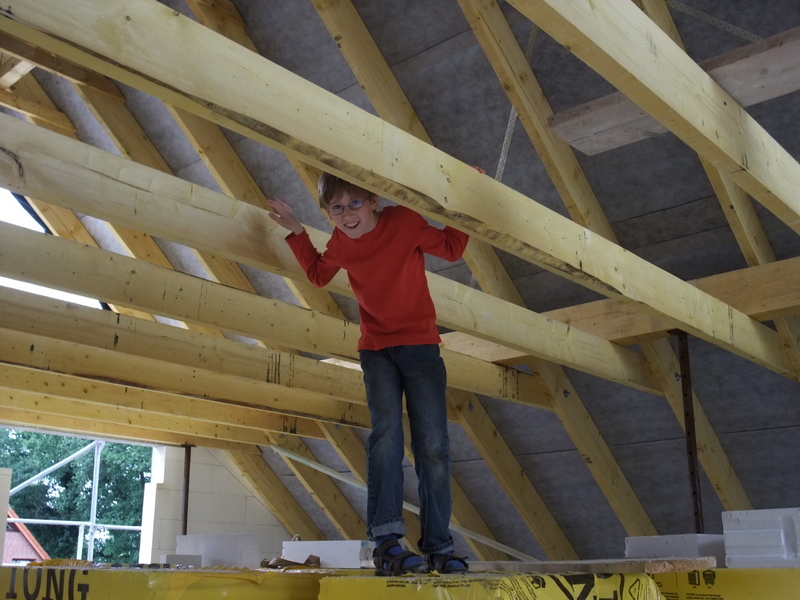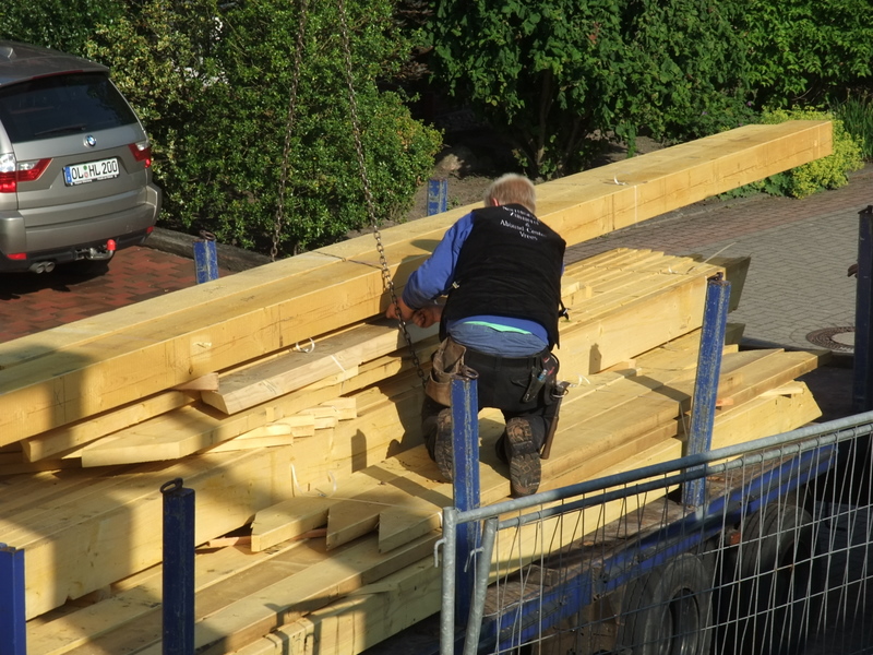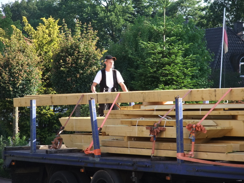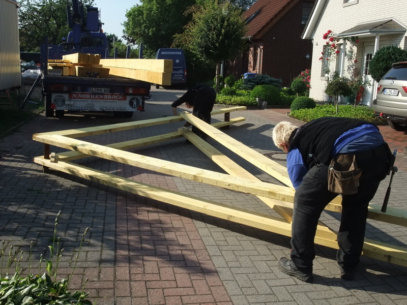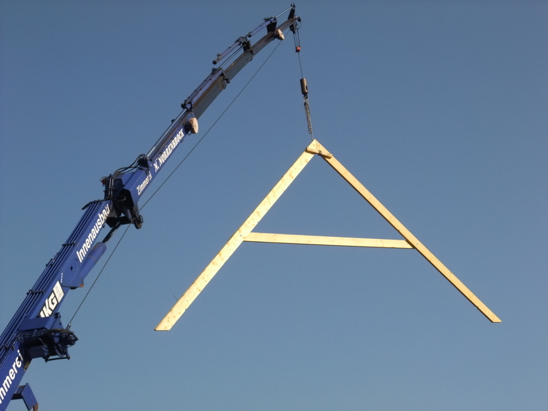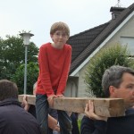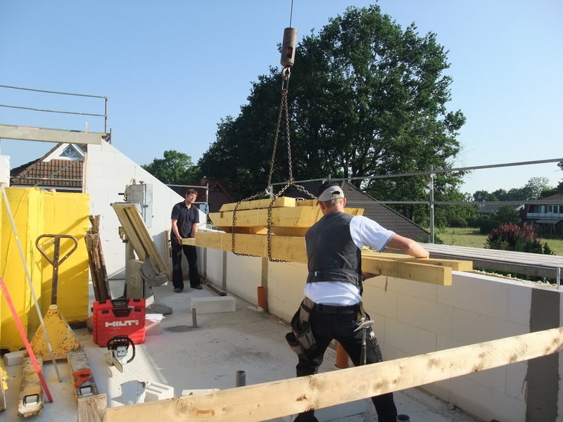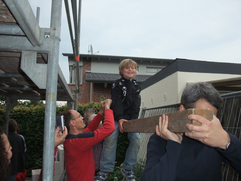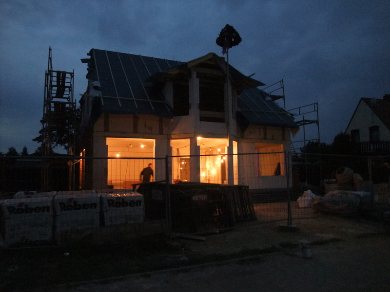 Um 8 Uhr sind die Zimmerleute gekommen, um 14 Uhr war der Spuk vorbei. Leider blieben die Zimmerleute nicht bis zum Richtfest. Aber Herr Koopmann und seine Leute haben sie würdig vertreten.
