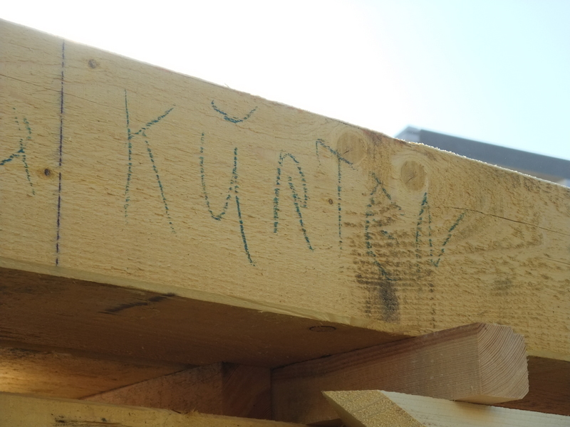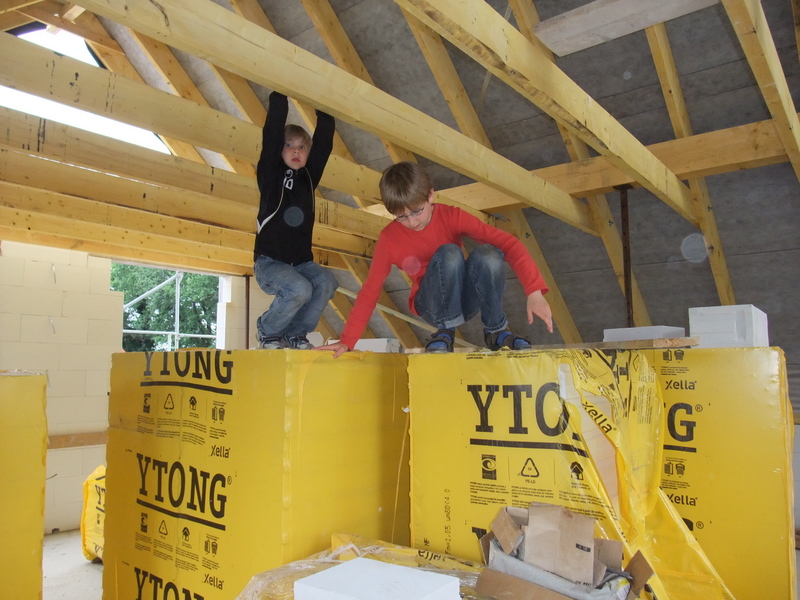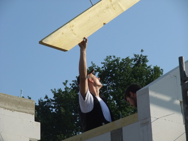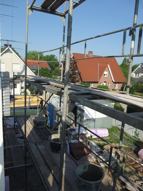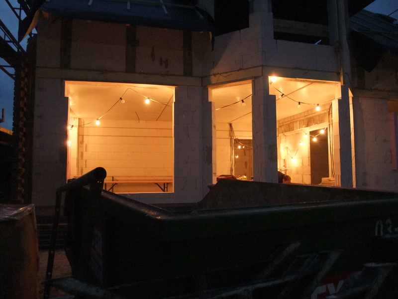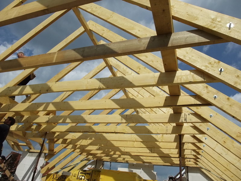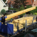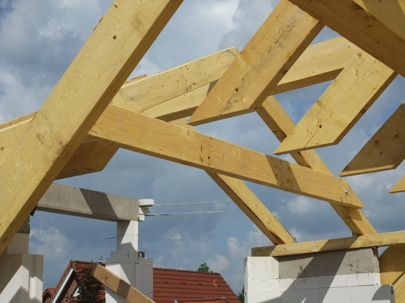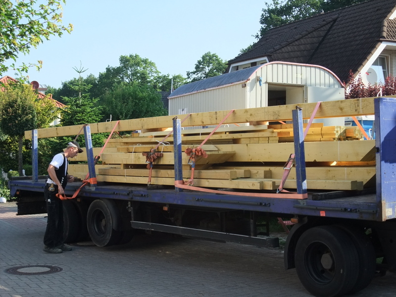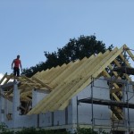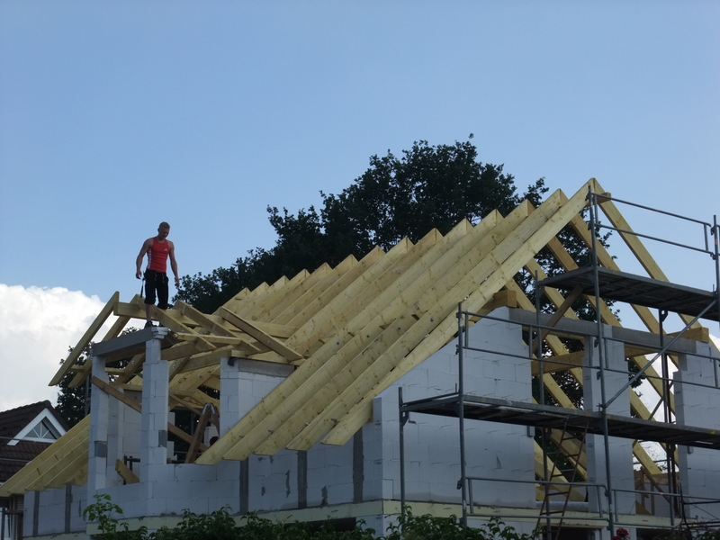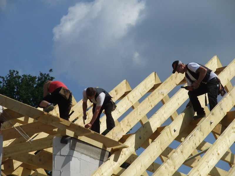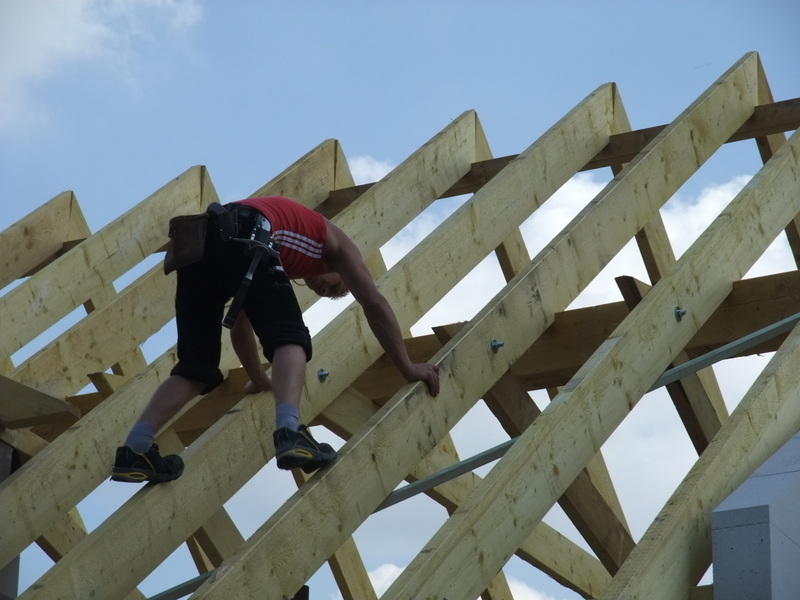 Um 8 Uhr sind die Zimmerleute gekommen, um 14 Uhr war der Spuk vorbei. Leider blieben die Zimmerleute nicht bis zum Richtfest. Aber Herr Koopmann und seine Leute haben sie würdig vertreten.