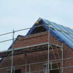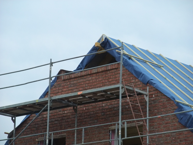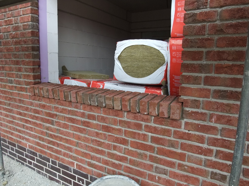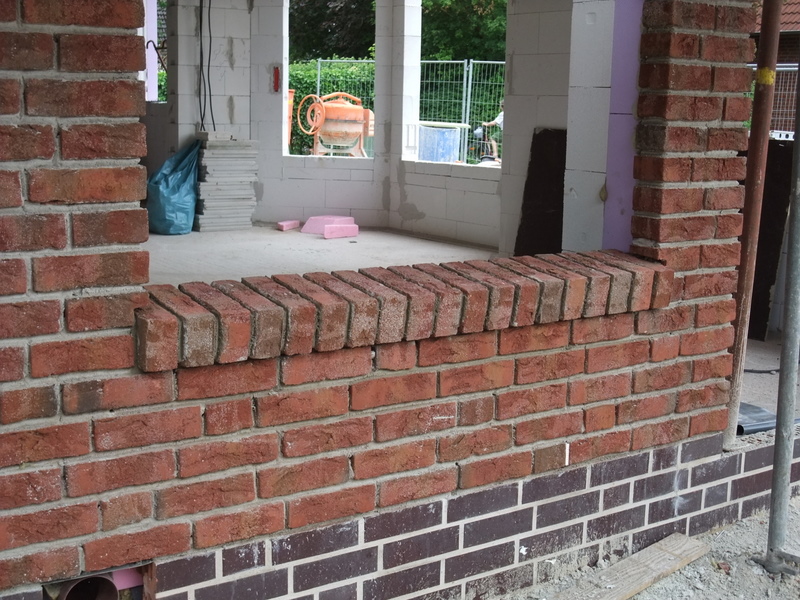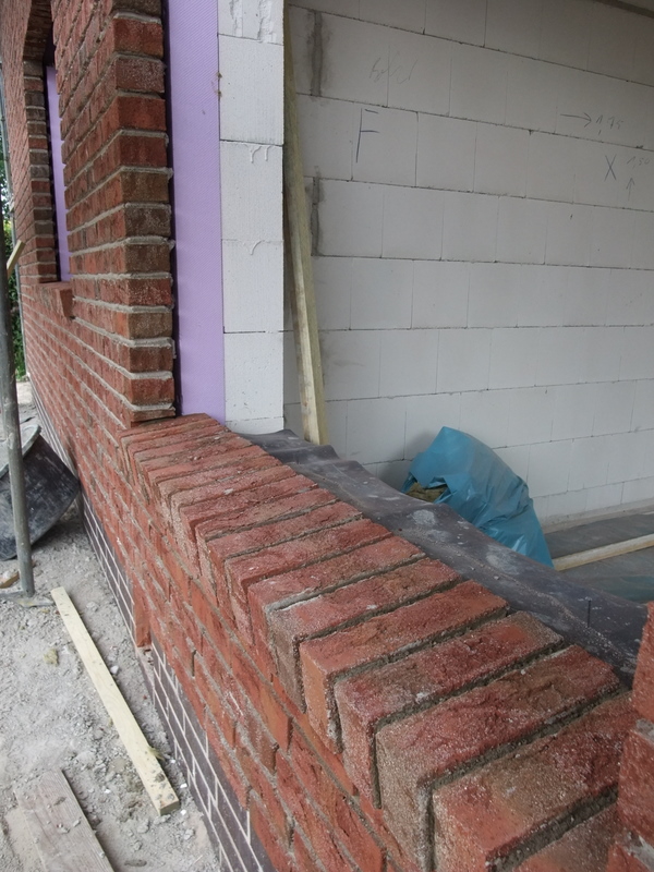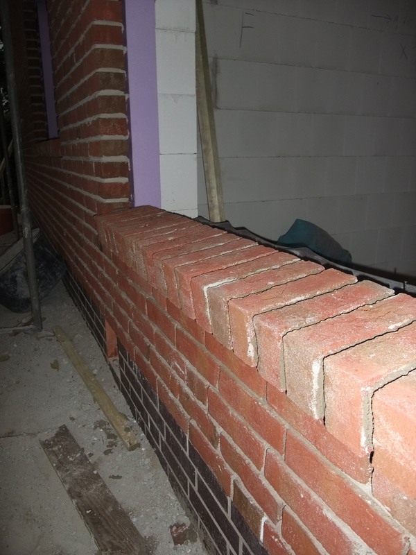 Die Außenfensterbänke wurden heute gemauert. Im Dachgiebel werden wir nun doch auf beiden Seiten ein Giebelfenster vorsehen, noch sind Änderungen möglich, die Fassade auf der Eingangsseite ist noch nicht bis oben gemauert und verblendet.