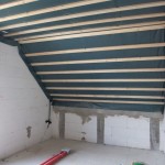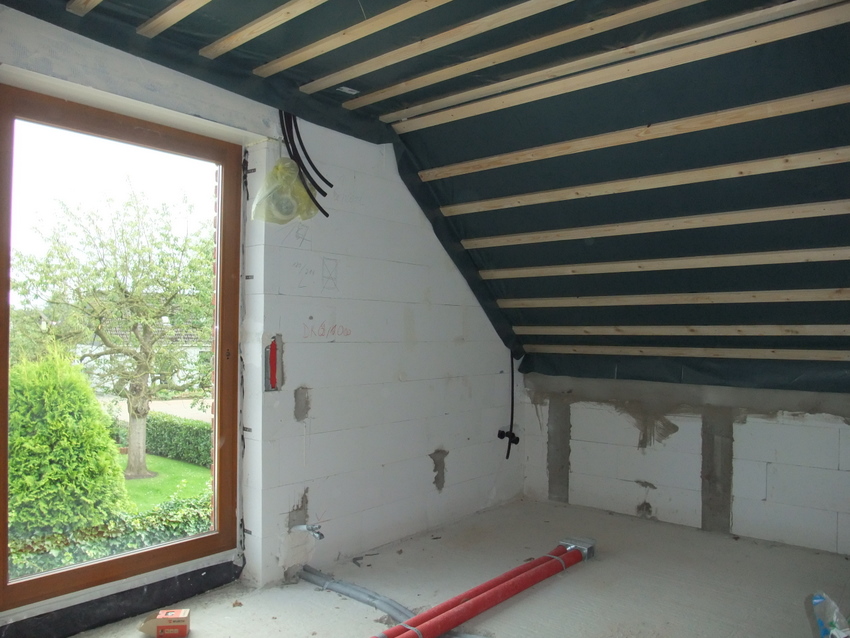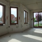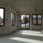 Im Obergeschoss werden gerade die Decke isoliert und Sparren für die Decke verschraubt. Die großen bodentiefen Fenster lassen viel Licht in die Kinderzimmer. Außen fehlen noch die kleinen Balkon-Gitter.
