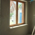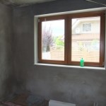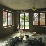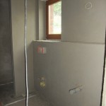 Die Elektriker sind fertig geworden mit dem Legen der Anschlußleitungen, während sich die Verputzer in das Erdgeschoss vorgearbeitet haben: