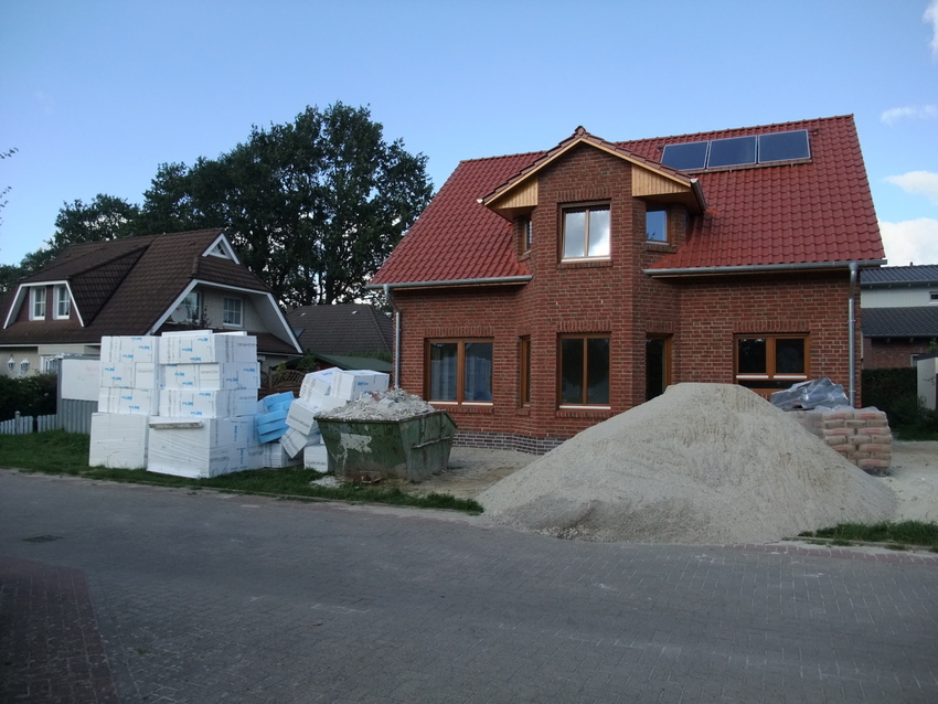 Ein Maschinenausfall verzögert die Estricharbeiten, die nun erst am Mittwoch beginnen. Aber das Material lagert schon vor dem Haus: