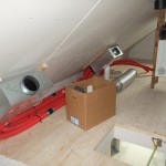 Auf dem Dachboden wurde die Lüftungsanlage installiert und die Schläuche schon großteils angeschlossen. Im Keller wurde die Gasleitung vom Hausanschluß zur Gas-Brennwerttherme angeschlossen. Für die Elektroverteilung ist der Elektrokasten schon da, aber es ist noch nichts installiert worden.