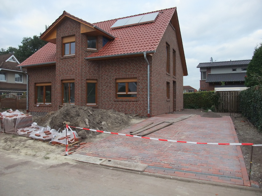 Seit letzter Woche laufen die Pflasterarbeiten für die Einfahrt und die Zuwegung zum Hintereingang. Seit Freitag ist die Heizung in Betrieb und nach dem Studium der Bedienungsanleitung habe ich sogar ein Estrichtrockenprogramm entdeckt und gestartet.